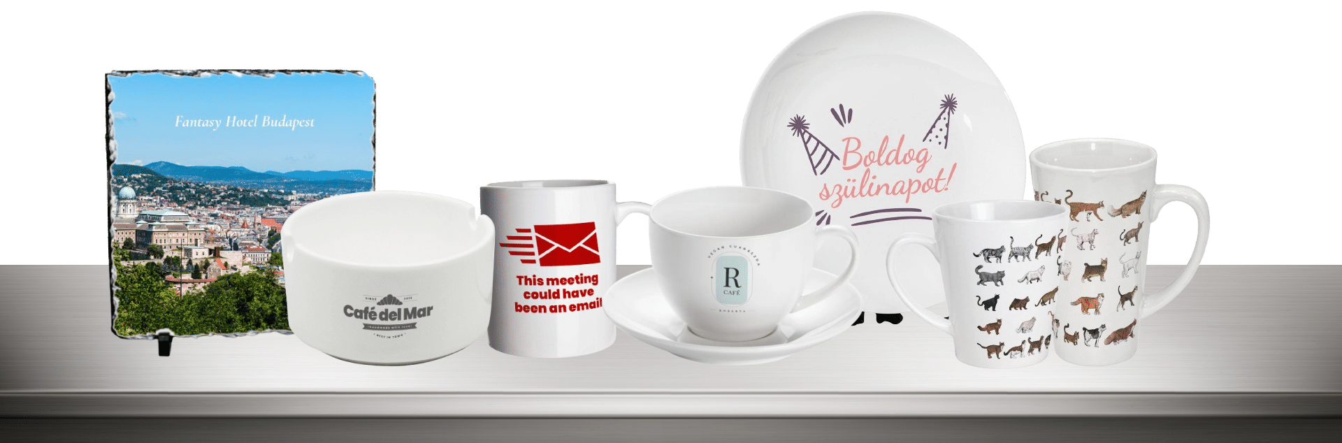 Különösen nagy népszerűségnek örvendenek tányérok, felespoharak és poharak, bögrék, korsók. Ezek közül is kiemelendő az örök klasszikus bögre, mely amellett, hogy nagyszerű reklám és ajándéktárgy univerzális ívó alkalmatosság, dekorációs eszköz is.