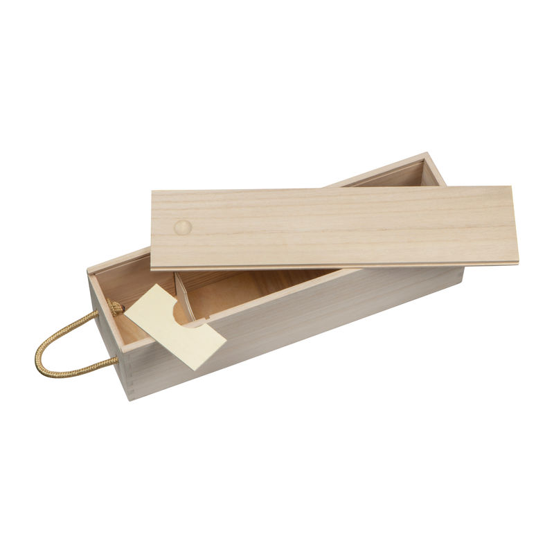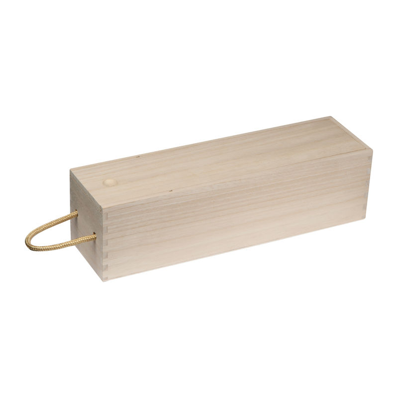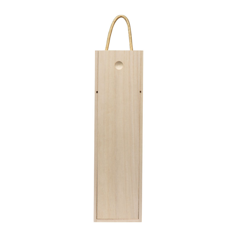 Világos fából készült bortartó doboz, beépített tolózárral és fogórésszel.