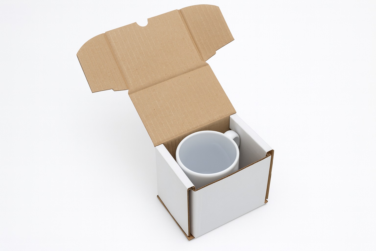 Praktikus és biztonságos duplafalú kartondoboz kerámiabögrék csomagolásához. Erős, kétfalú kialakítása megóvja a bögrét szállítás közben, a belső kialakítás pedig stabilan tartja a terméket. Ideális webshopoknak, ajándéktárgyakhoz vagy egyedi nyomtatott bögrékhez.