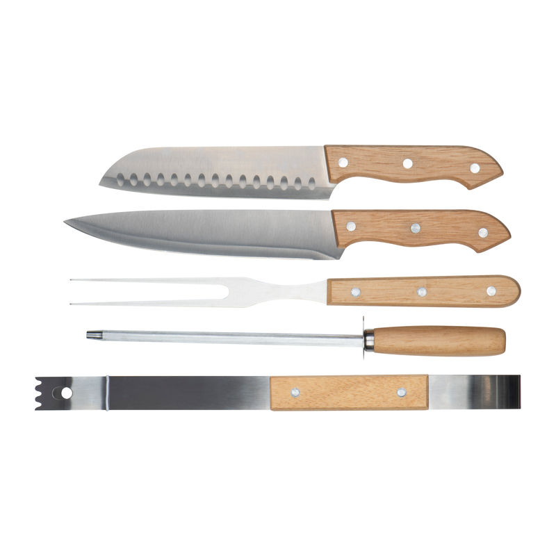 Grillezőkészlet, amely egy nagy fadeszkából, két rozsdamentes acél pengével ellátott késből, grillfogóból, húsvillából és késélezőből áll, poliészter tokban.