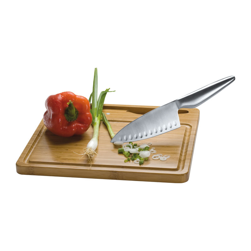 Figyelmébe ajánljuk bambusz vágódeszkánkat, mélyedésébe egy rozsdamentes acél pengéjű kést helyzetünk el. A könnyű tárolás érdekében a kést mágnessel rögzítettük a deszkához.