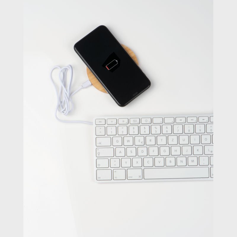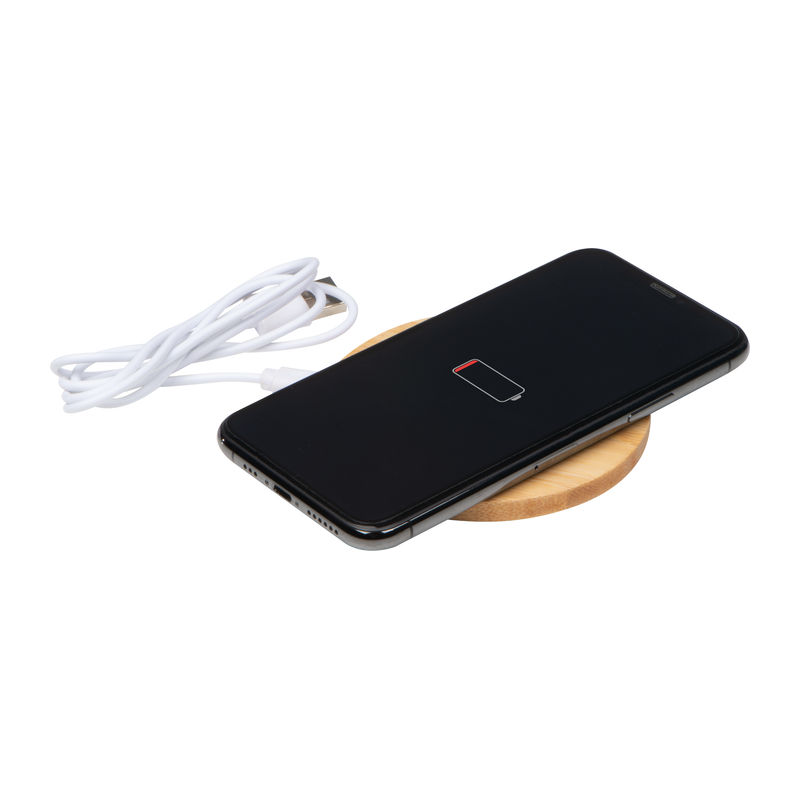 Bambusz borítású indukciós vezetéknélküli töltő töltőkábellel, mely minden QI szabvánnyal elátott eszközzel kompatibilis.