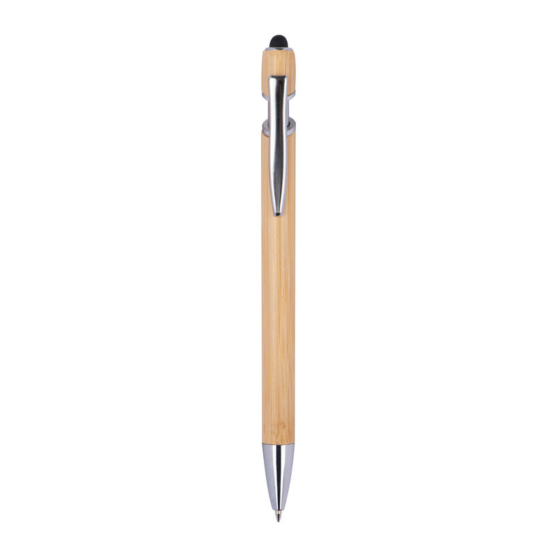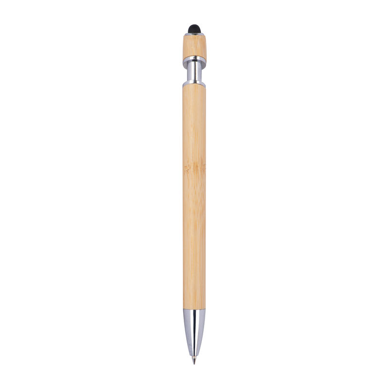 Bambusz golyóstoll ezüst díszítéssel, kéken író nagykapacitású tollbetéttel és érintőpárnával.