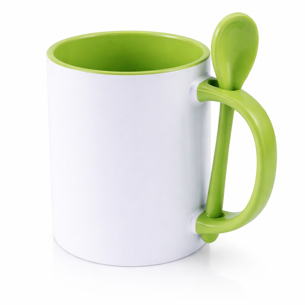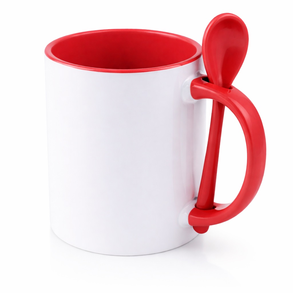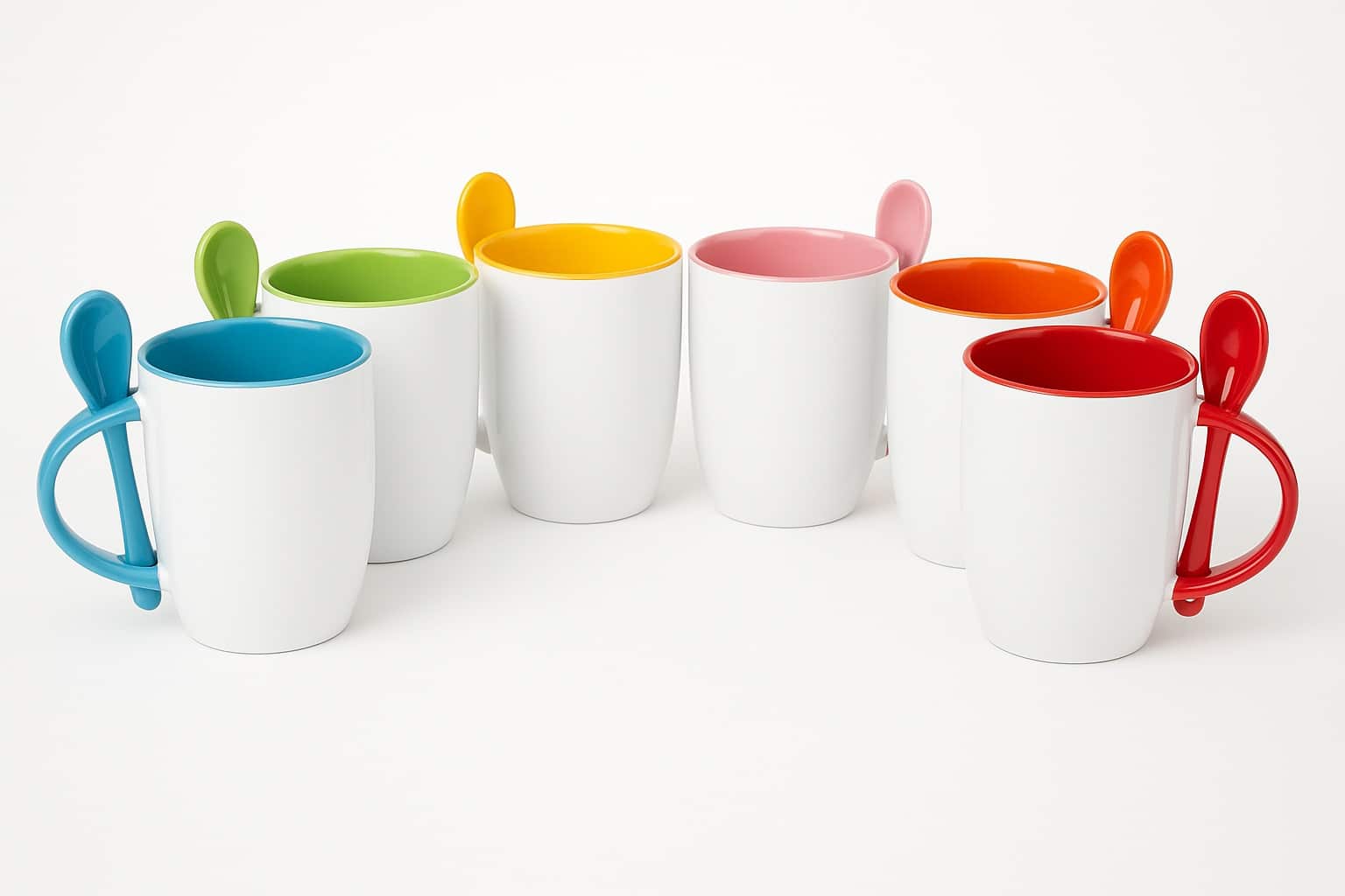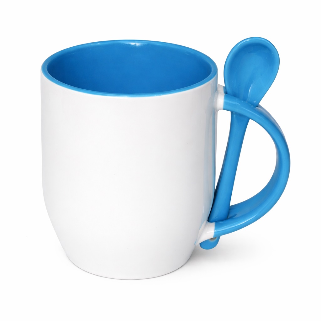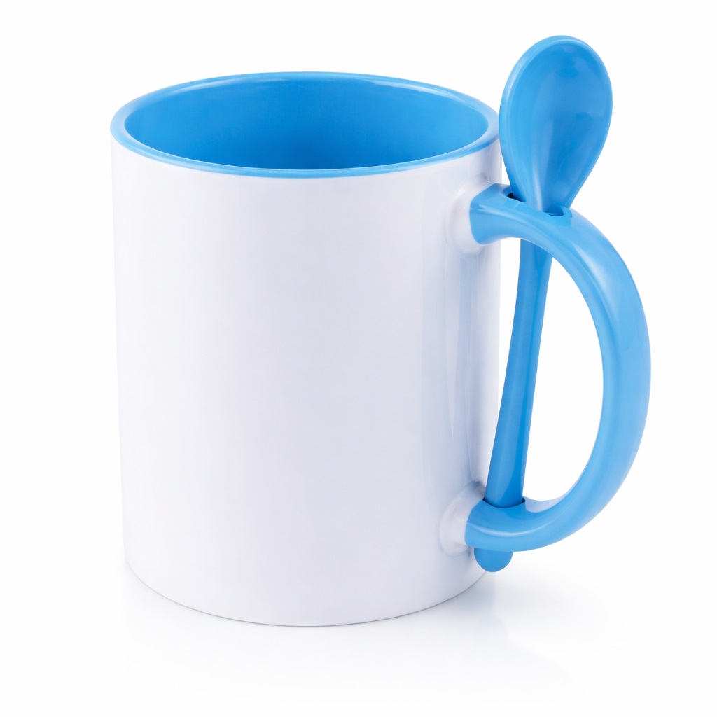A színes fülű és belsejű szublimációs bögre kanállal egy figyelemfelkeltő, egyedi ajándéktárgy vagy promóciós termék elkészítéséhez ideális kerámia alap, amelyet hőpréses szublimációval saját grafikával vagy felirattal személyre szabhatsz.