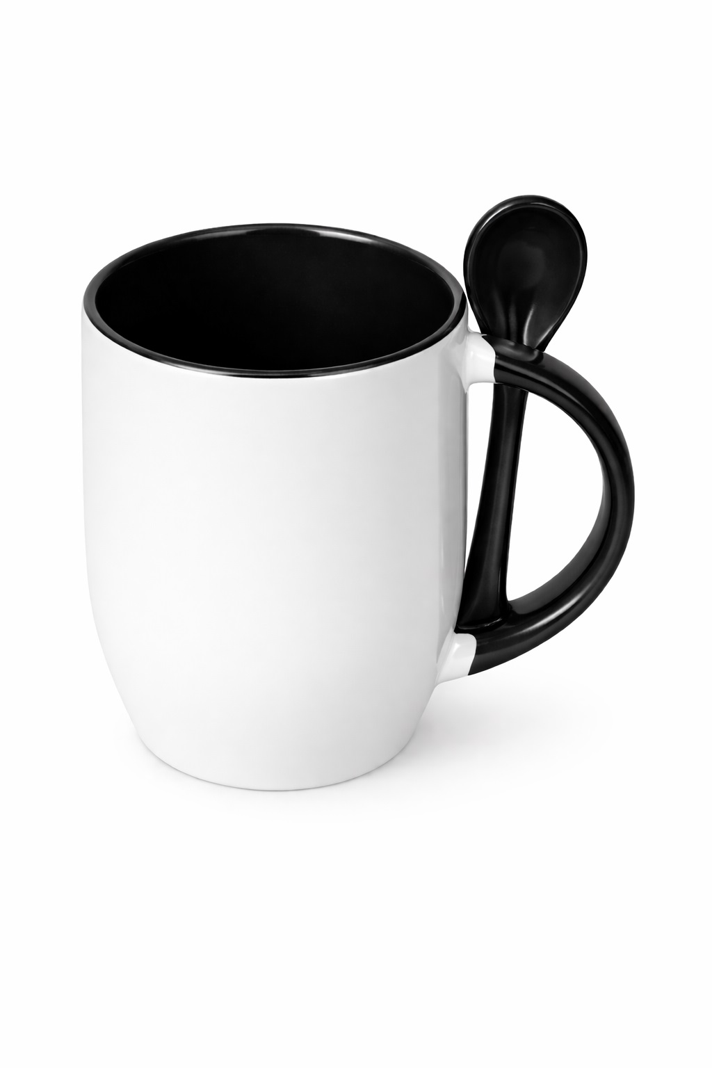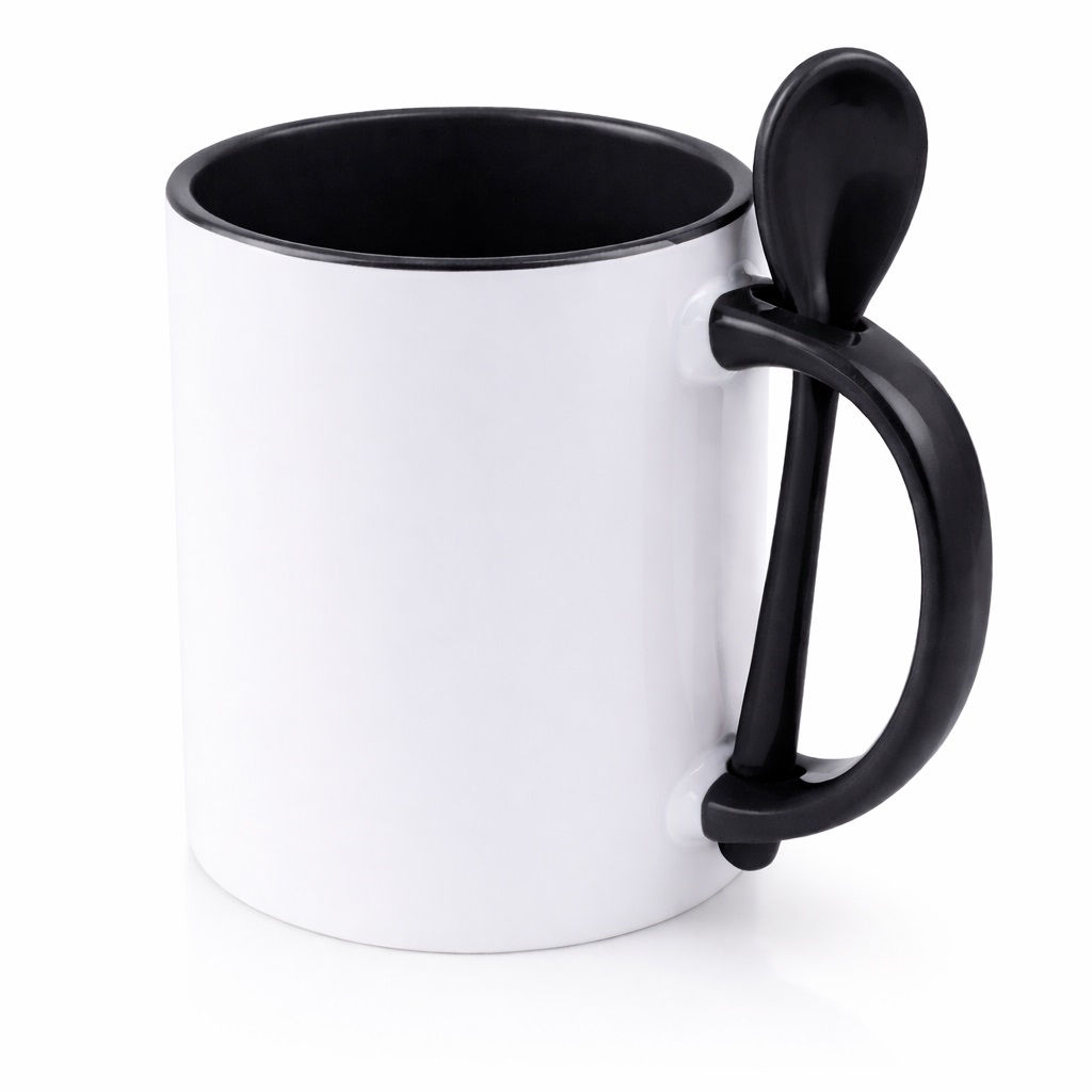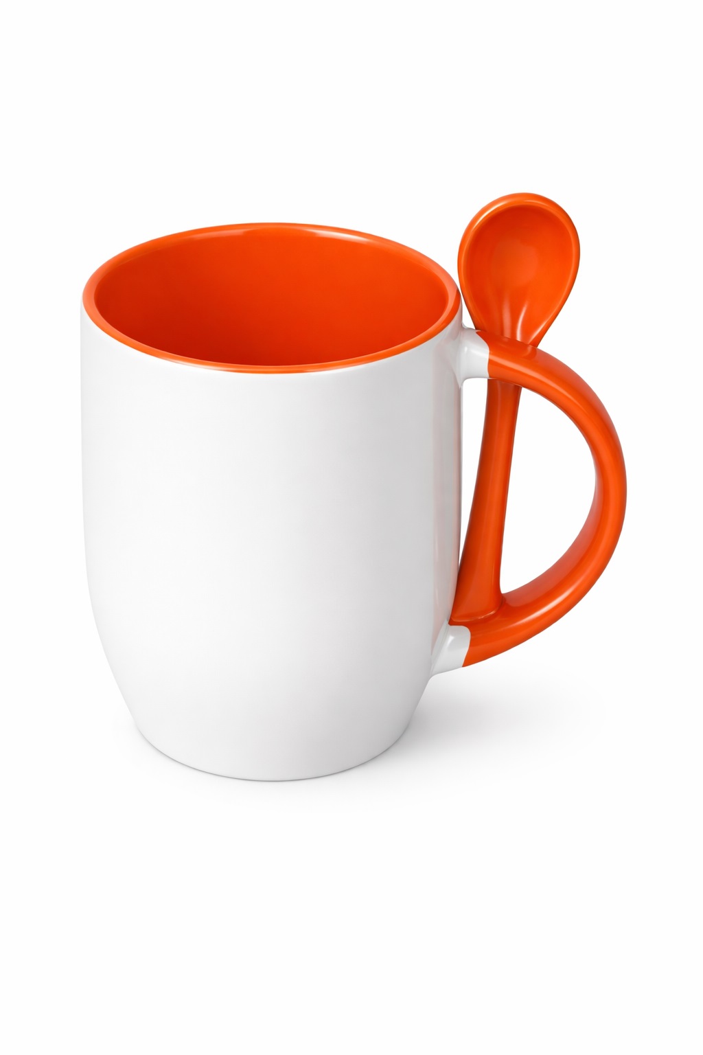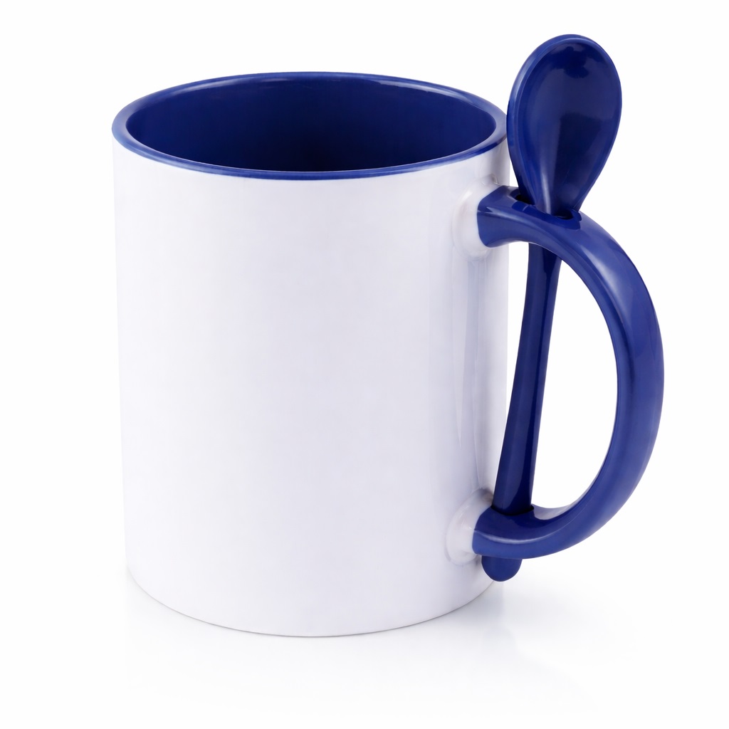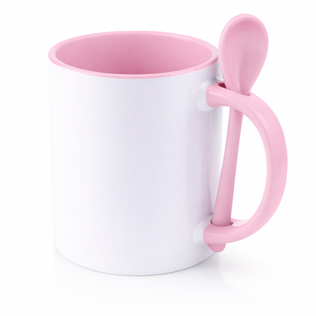 A színes fülű és belsejű szublimációs bögre kanállal egy figyelemfelkeltő, egyedi ajándéktárgy vagy promóciós termék elkészítéséhez ideális kerámia alap, amelyet hőpréses szublimációval saját grafikával vagy felirattal személyre szabhatsz.