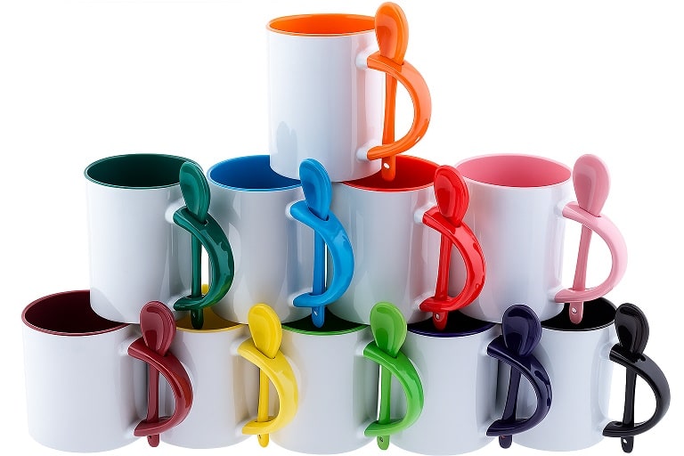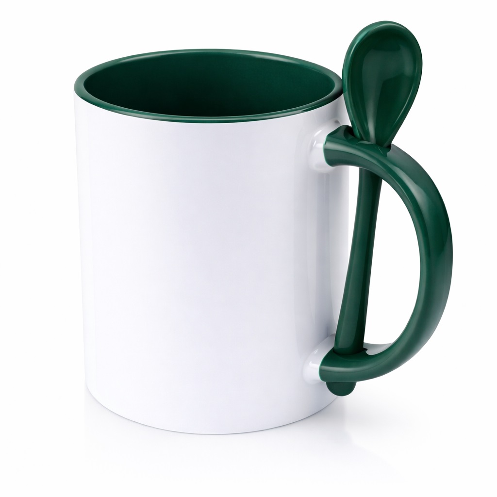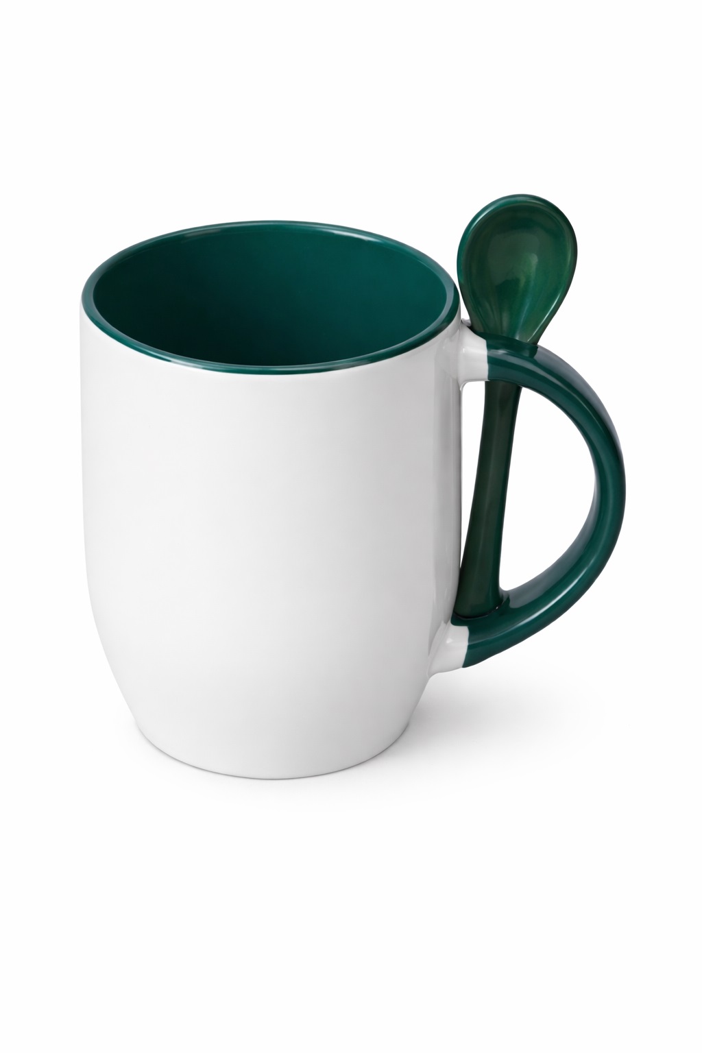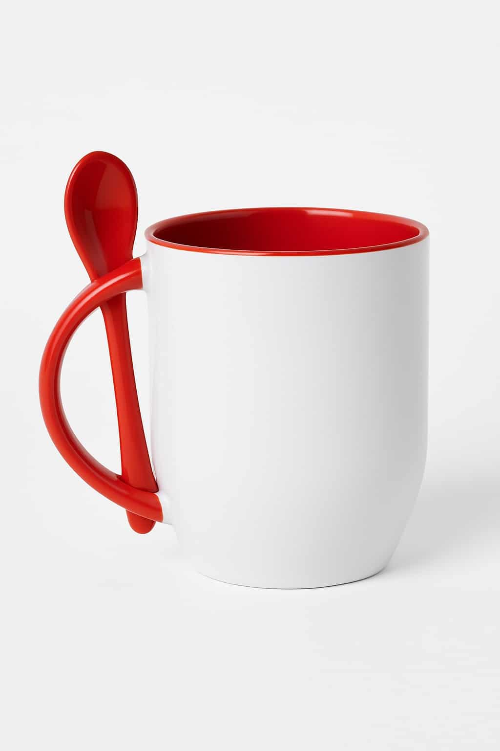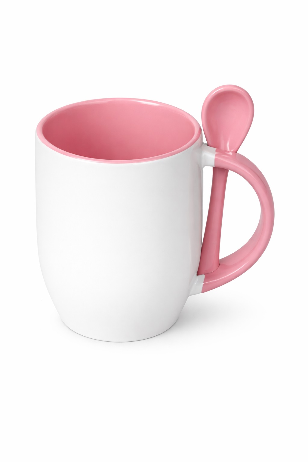 A színes fülű és belsejű szublimációs bögre kanállal egy figyelemfelkeltő, egyedi ajándéktárgy vagy promóciós termék elkészítéséhez ideális kerámia alap, amelyet hőpréses szublimációval saját grafikával vagy felirattal személyre szabhatsz.