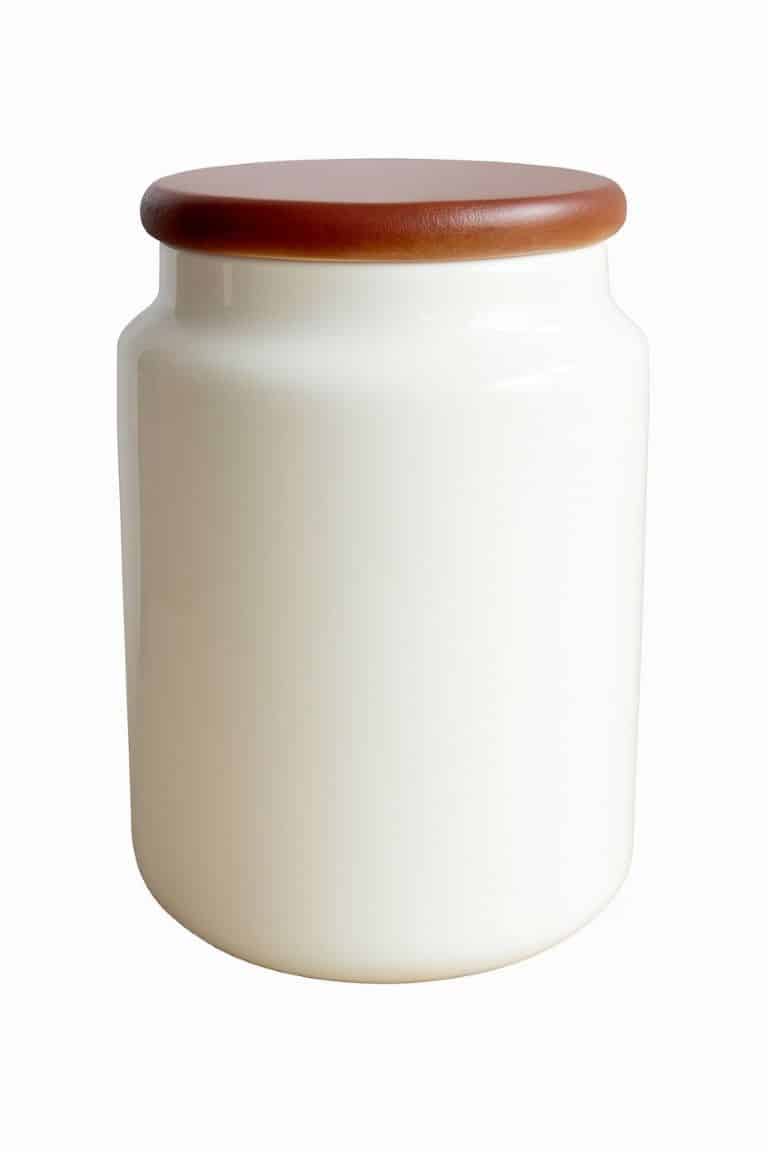 Ez a letisztult, fehér kerámia tárolóedény fa fedéllel nemcsak praktikus, de személyre szabható is – tökéletes választás otthoni keksztárolásra vagy egyedi grafikával rendelhető ajándéknak.